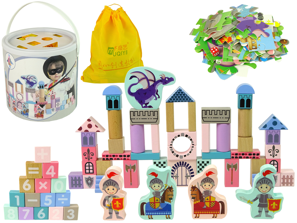 Un joc captivant si educativ care stimuleaza imaginatia si creativitatea copiilor. Acest set include atat blocuri din lemn colorate, care pot fi folosite pentru a construi un castel impresionant, cat si un puzzle tematic cu imaginea unui castel si a unui dragon, adaugand o nota de aventura in jocurile de constructie.