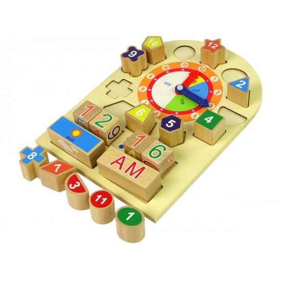 Setul contine 12 blocuri de diferite forme si culori care indica anumite ore, fiecare dintre ele potrivindu-se doar in spatiile delimitate special pentru ele. Sarcina copilului include identificarea formelor si plasarea acestora in golurile proprii, folosindu-se principiul sortarii.