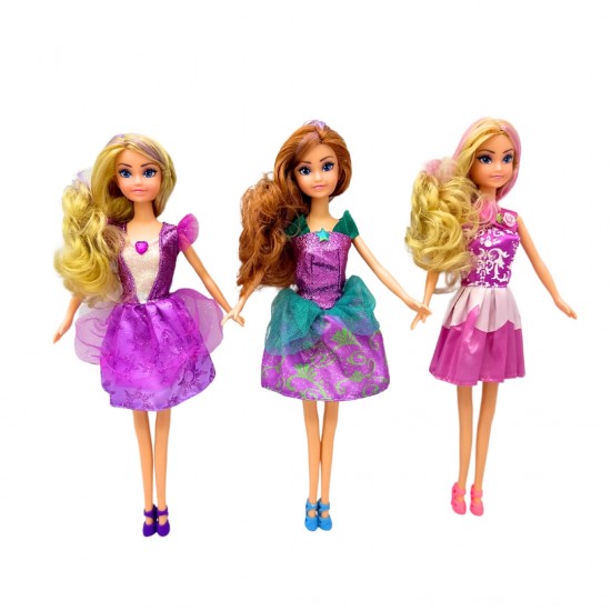 Aceasta papusica este un cadou excelent pentru fetitele care iubesc sa creeze lumi fantastice si sa joace roluri diverse. Aceasta papusa este disponibila in trei variante cu vestimentatie diferita cu sclipici, cu par lung si matasos care poate fi pieptanat si coafat.