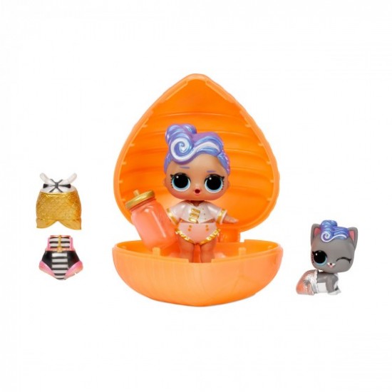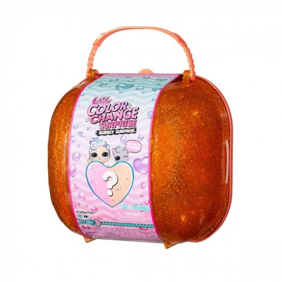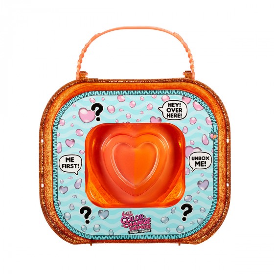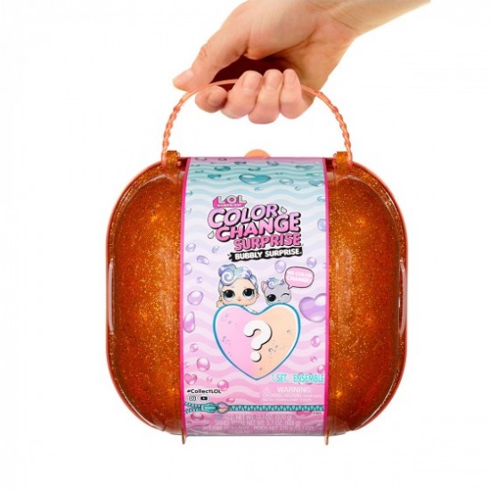 Setul de joaca cu papusa L.O.L SURPRINDE! Seria "Color Change Bubbly" este un nivel cu totul nou de surprize! In interiorul valizei stralucitoare se afla 6 mini-surprize ascunse in nisip cinetic, iar cel mai important lucru - o uriasa surpriza gazoasa in forma de inima!