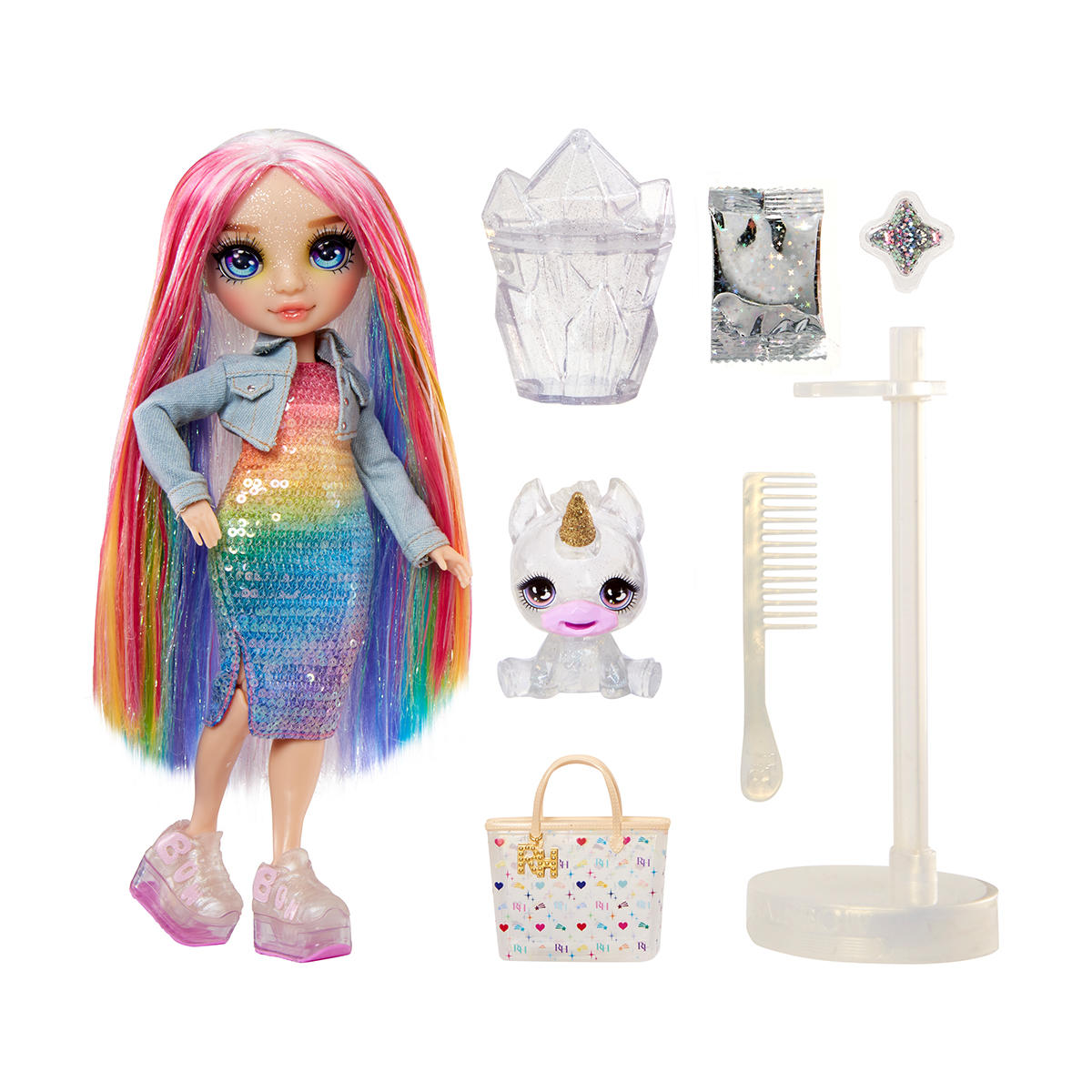 Papusa RAINBOW HIGH este o frumusete eleganta, cu par si haine in culorile curcubeului, cu par lung luxos care poate fi pieptanat si creat in diverse coafuri.