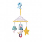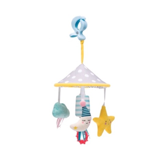 Pandantiv pentru carucior elegant. Emite sunetul unui clopotel, care cu siguranta va amuza copilul in timpul plimbarilor. Pandantivul se fixeaza pe carucior cu o clama. Jocul cu luna agatata, cu un nor si o steluta, ii va dezvolta perceptia senzoriala si activitatea motorie a copilului.