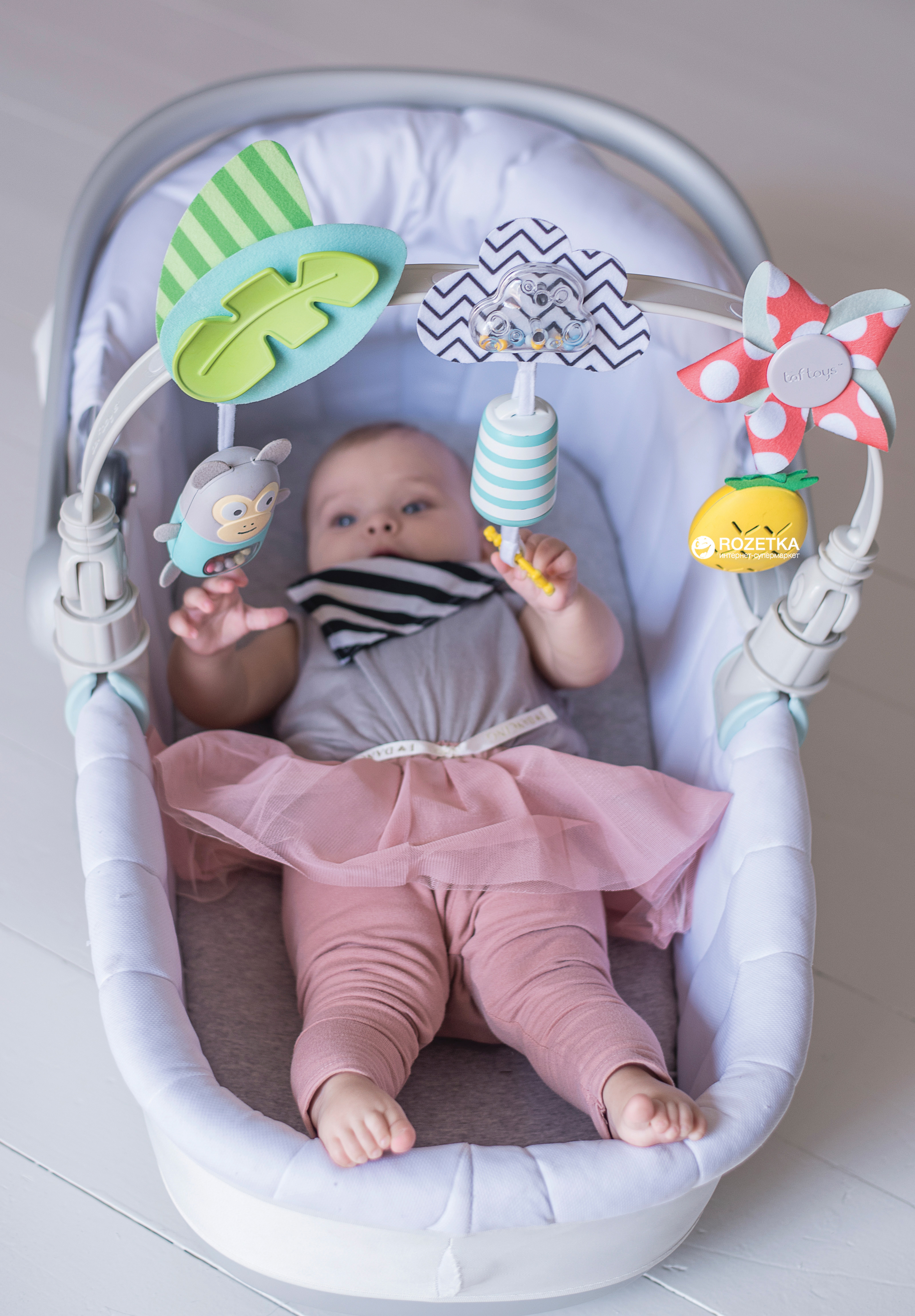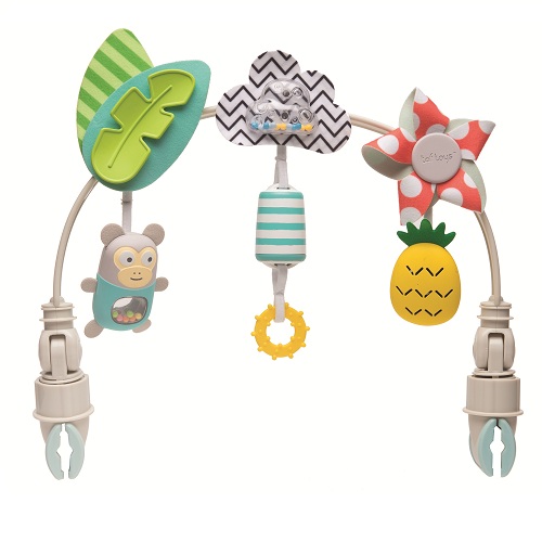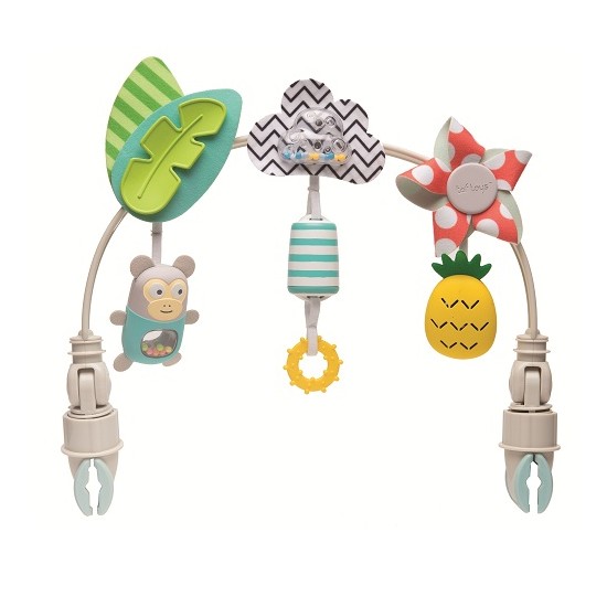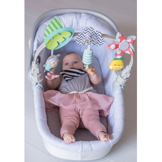 Un arc flexibil, cu jucariile extraordinare, promoveaza studiul sunetelor copilului, dezvolta perceptia senzoriala si a activitatea motoricii fine. Jucariile-pandantive transmite sunetele de instrumente muzicale - clopot, chimvale, maracas! Cind copilul atinge jucaria cu piciorul sau minuta, ca recompensa va auzi un sunet interesant. Clamele sunt convenabile si usor si ferm pot fi atasate la majoritatea leaganilor, carucioarelor, scaunelor pentru copii si scaunelor pentru masini, care distreaza copilul pe drum.