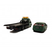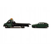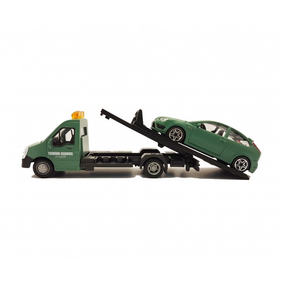 Transportorul auto verde este echipat cu o platforma mobila pentru ridicarea rapida a masinii.