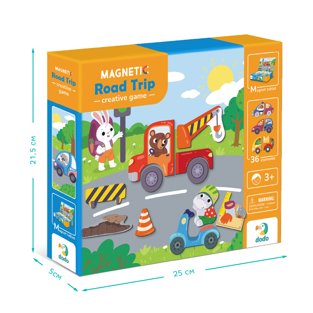 Setul de joaca magnetic ,,In Calatorie" este un set captivant conceput pentru copiii pentru a merge in calatorii incredibile si pentru a-si crea propriile povesti. Acest set include o placa magnetica si 36 magneti cu diverse piese de transport si elemente de aventura rutiera.