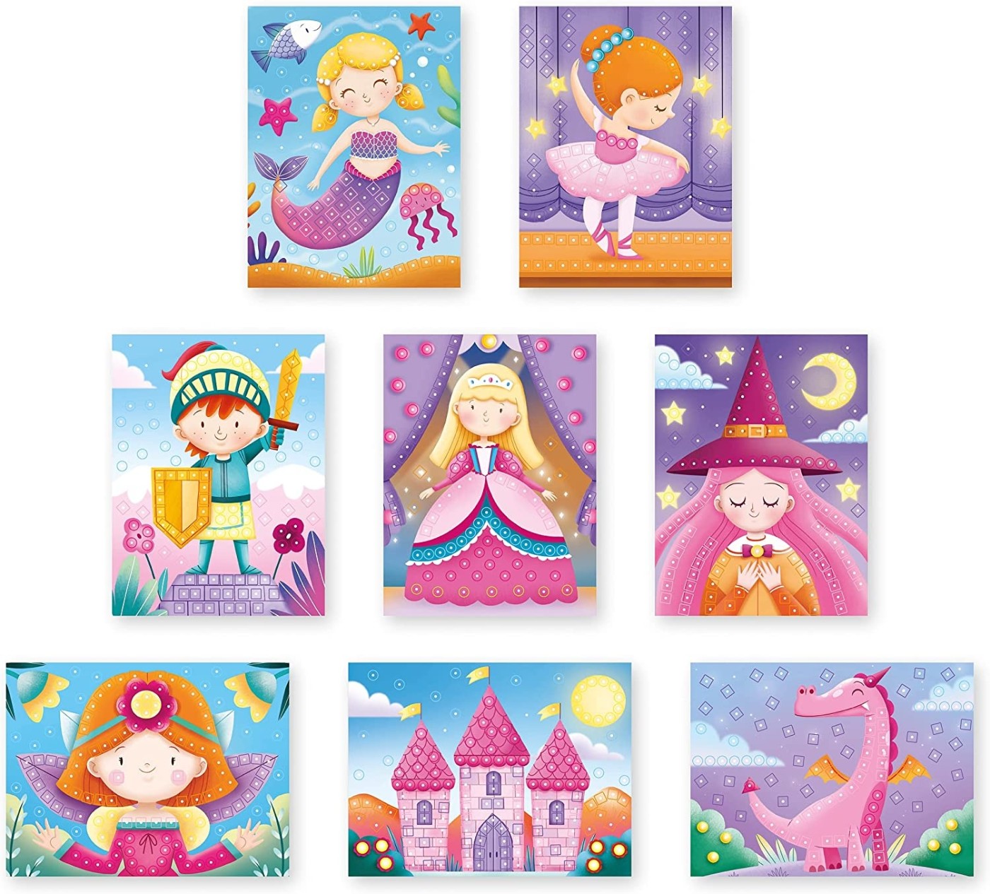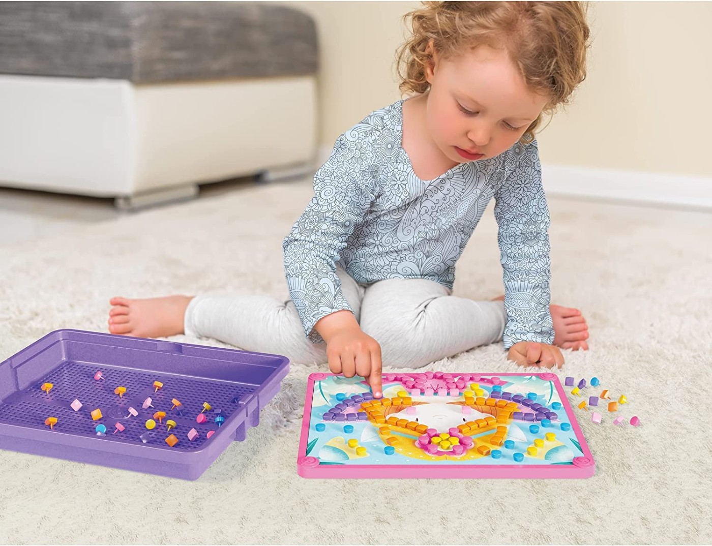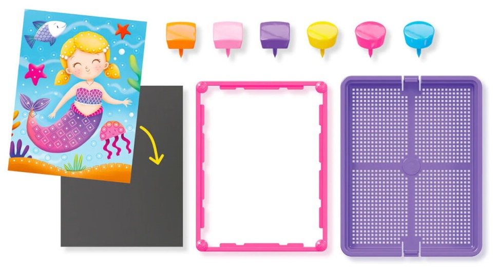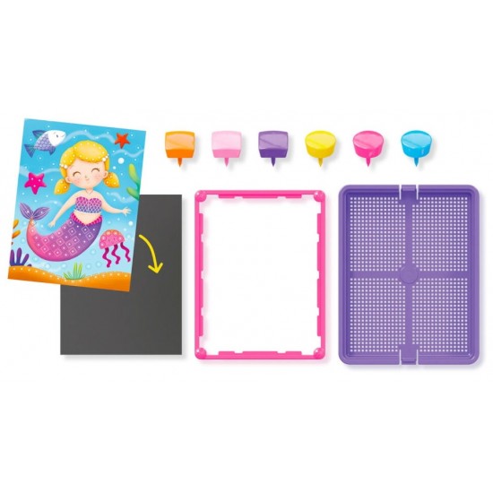 Cu acele colorate, rotunde si patrate, puteti perfora cele 8 cartonase ilustrate, urmarind culoarea de baza si creand mozaicuri frumoase. Rama va infrumuseteaza opera de arta, iar cosul va ajuta sa colectati toate acele si sa le pastrati in ordine dupa ce ati terminat de jucat.