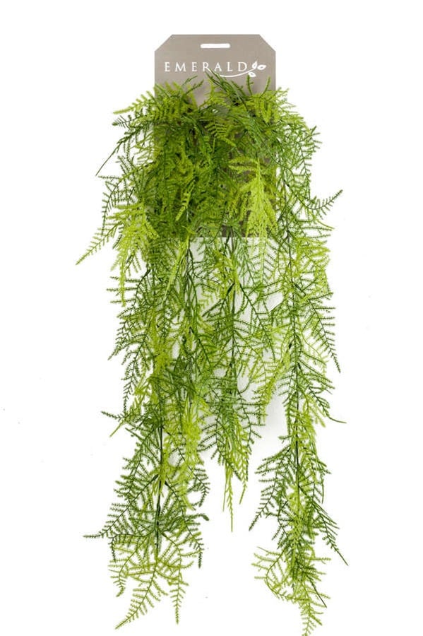 O alegere eleganta pentru decor interior - tufa suspendata Asparagus plumosus, lunga de 80 cm, cu 6 ramuri fine. Frunzisul bogat din mase plastice reda perfect textura aerata a plantei naturale, fiind perfecta pentru colturi sau pereti decorativi.