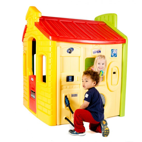 Benzinaria este echipata cu pompa pentru combustibil care este perfecta pentru masinutele din seria Cozy Coupe. In interiorul casei avem o zona de studii echipata cu o masa si o tabla.