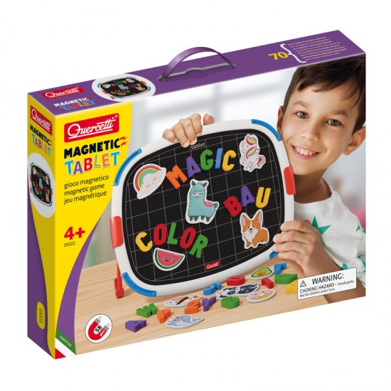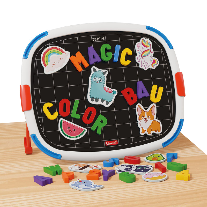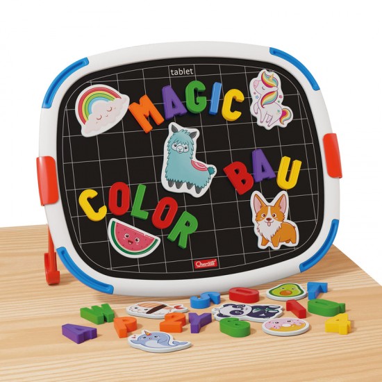O noua tabla magnetica fata-verso cu design inovator, muchii rotunjite. Colturile mesei sunt protejate cu o margine de cauciuc pentru a face jucaria absolut sigura pentru copii. Copiii pot atasa litere si numere magnetice la o masa sau pot scrie marcaje colorate. Setul include de asemenea magneti cu imagini care stimuleaza copiii sa scrie numele obiectelor sau animalelor pe acesti magneti.