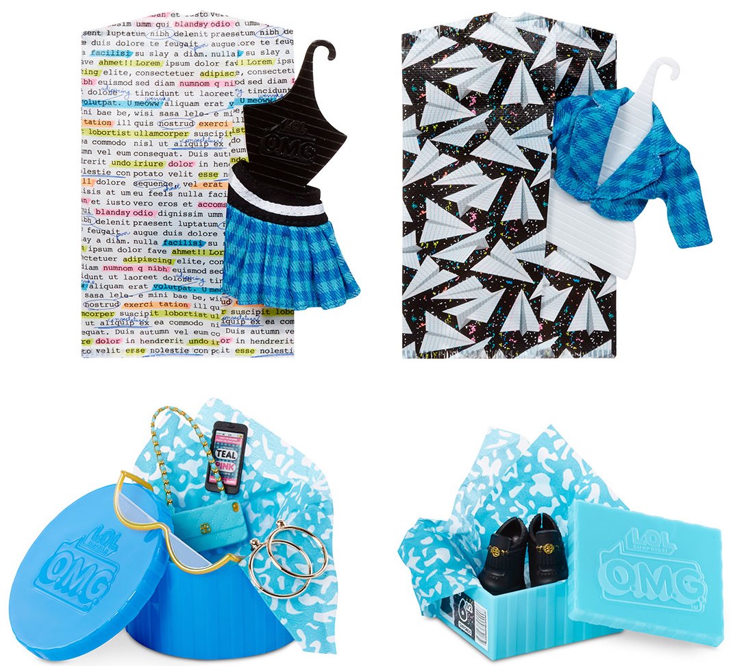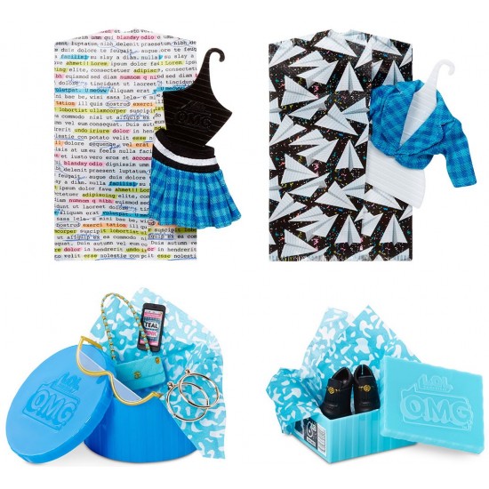 Setul include: papusa L.O.L. SURPRISE, seria O.M.G" seria 3, hainute, incaltaminte cu cutiuta, cercei, umerase, gentuta, pieptene, huse pentru haine, stand pentru papusa, accesorii, cutiuta-garderob.