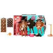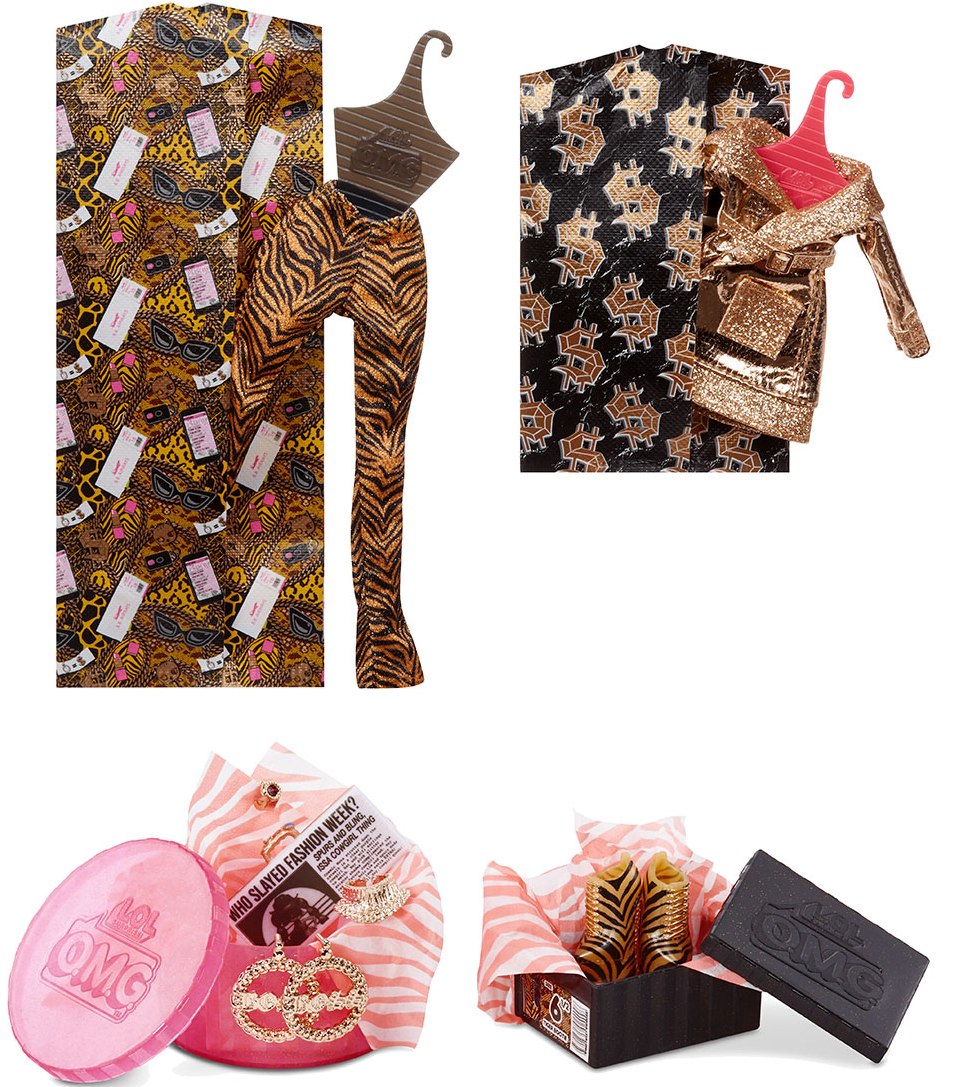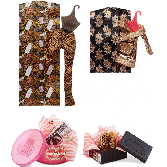 Setul include: papusa L.O.L. SURPRISE, seria O.M.G" seria 3, hainute, incaltaminte cu cutiuta, cercei, umerase, gentuta, pieptene, huse pentru haine, stand pentru papusa, accesorii, cutiuta-garderob.