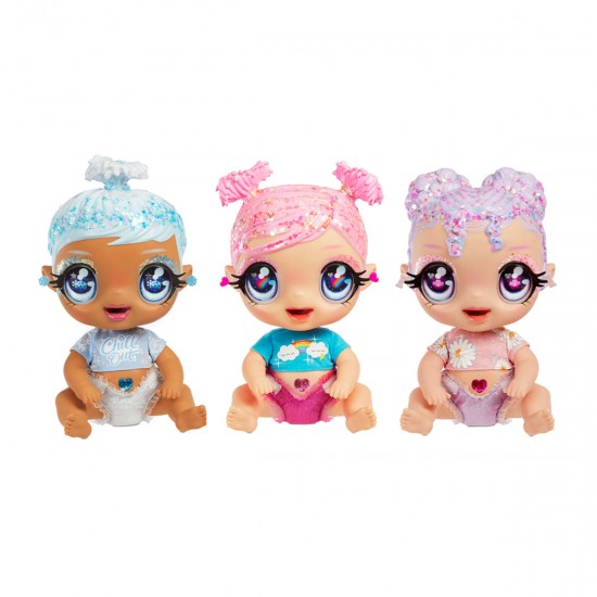 Sclipitoare si adorabile, unice si incantatoare, noile papusi bebelusi Glitter Babyz se nasc pe un taram magic, luminos si stralucitor. Fiecare papusa are un nume original, haine stilate si par sclipitor, ele beau din sticluta si fac pipi. Dar cel mai important este ca parul lor, sticluta pentru suc si sticluta pentru sampon isi schimba culoarea in apa rece. Bratele si picioarele lor sunt mobile iar in pozitie asezata papusa are o inaltime de 20 cm.