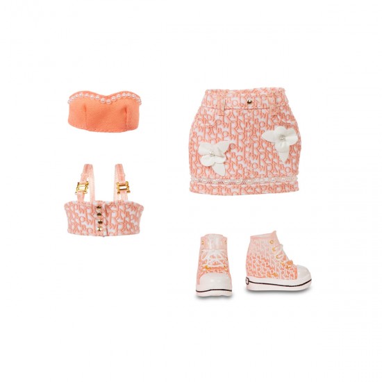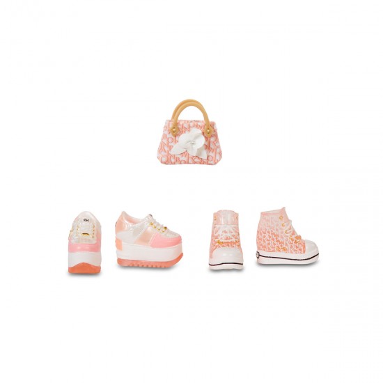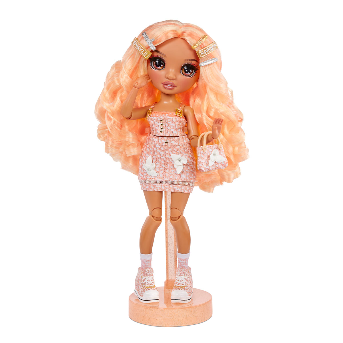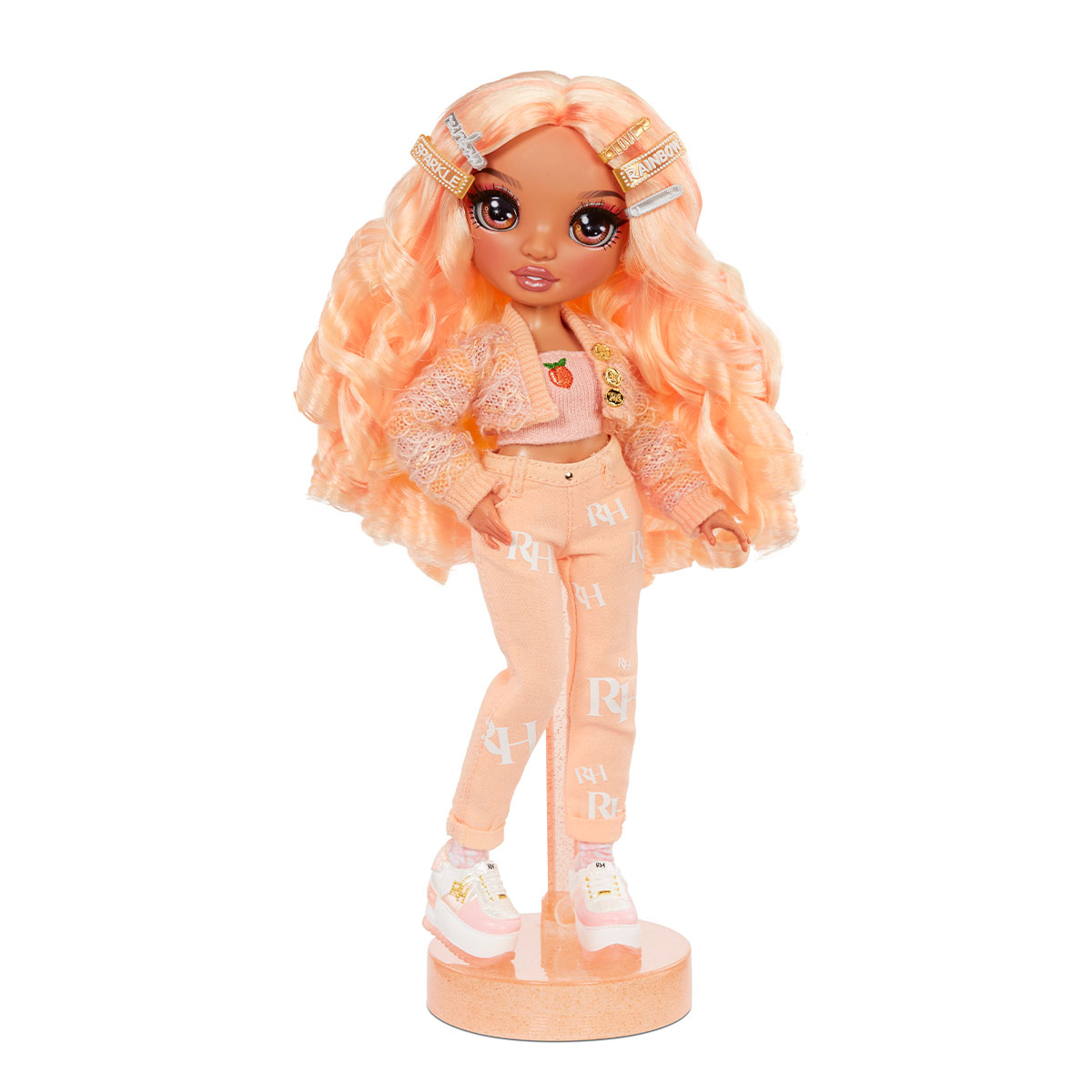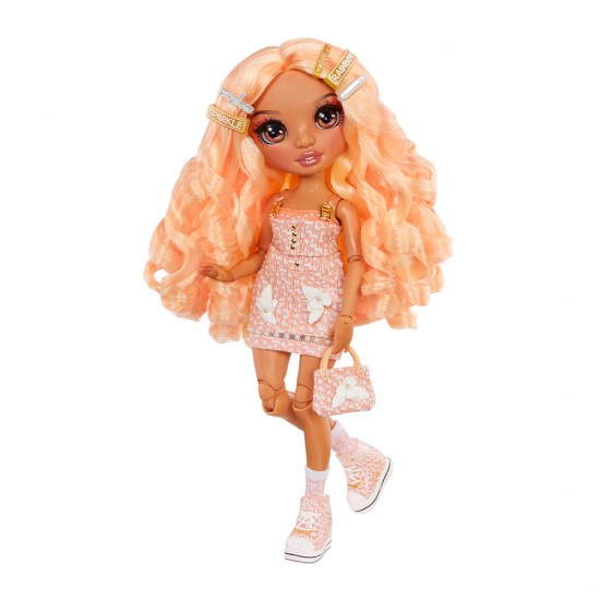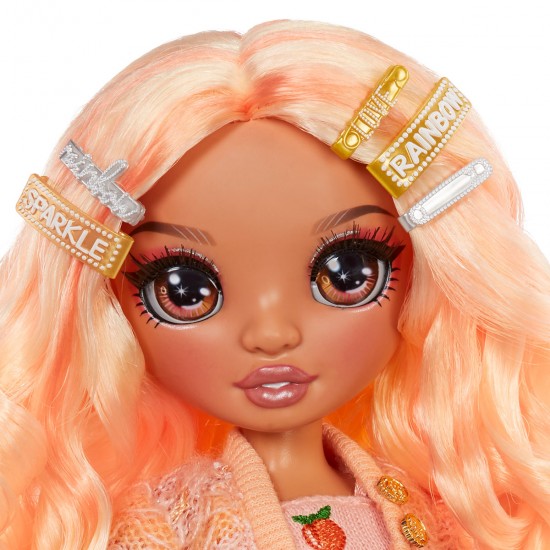Papusa RAINBOW HIGH S3 - Georgia Bloom (Piersic) este o frumusete fermecatoare, cu par si haine de culoare roz fin (piersic).