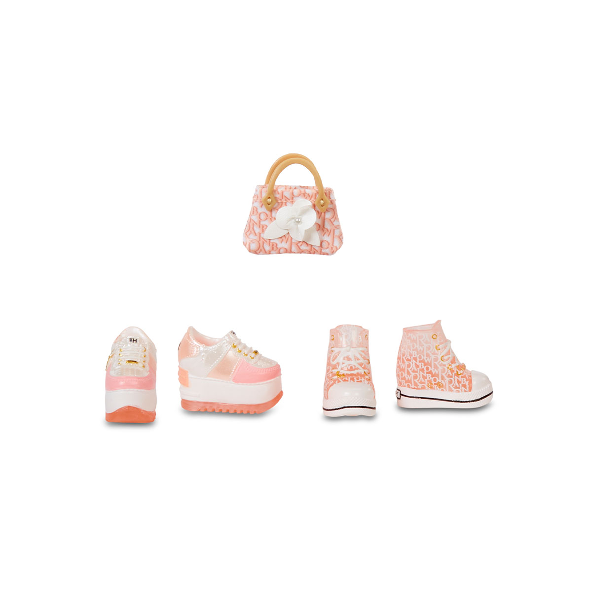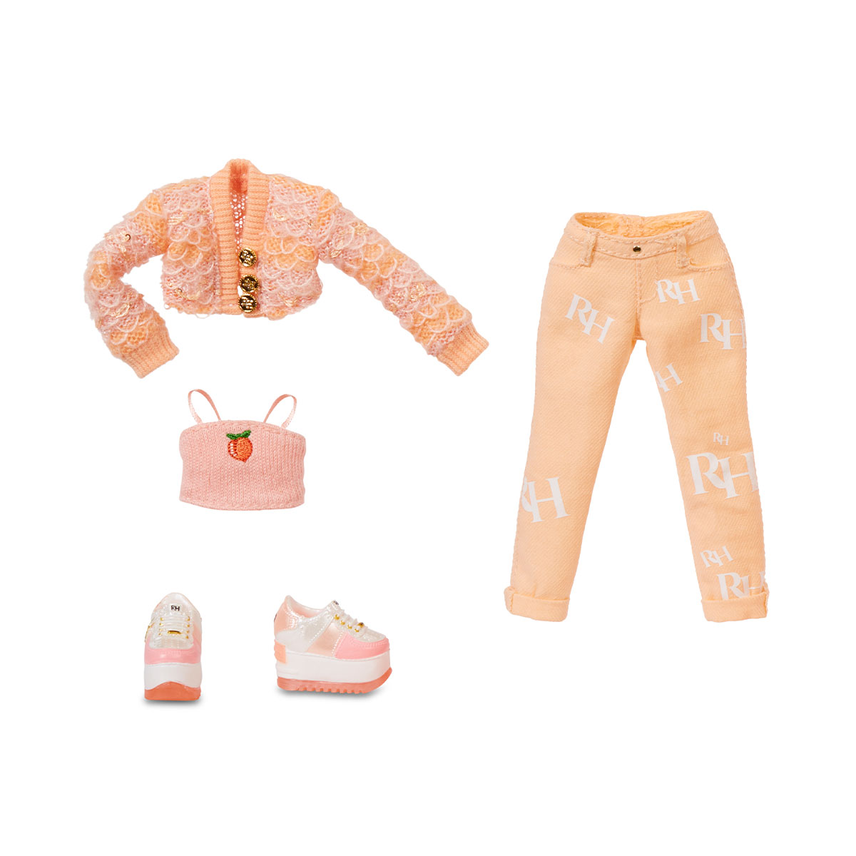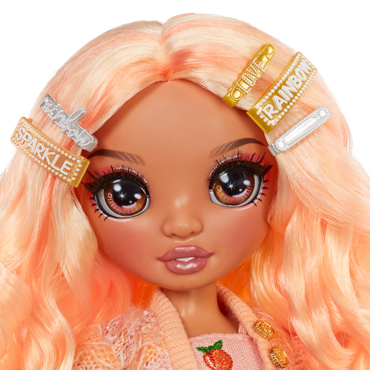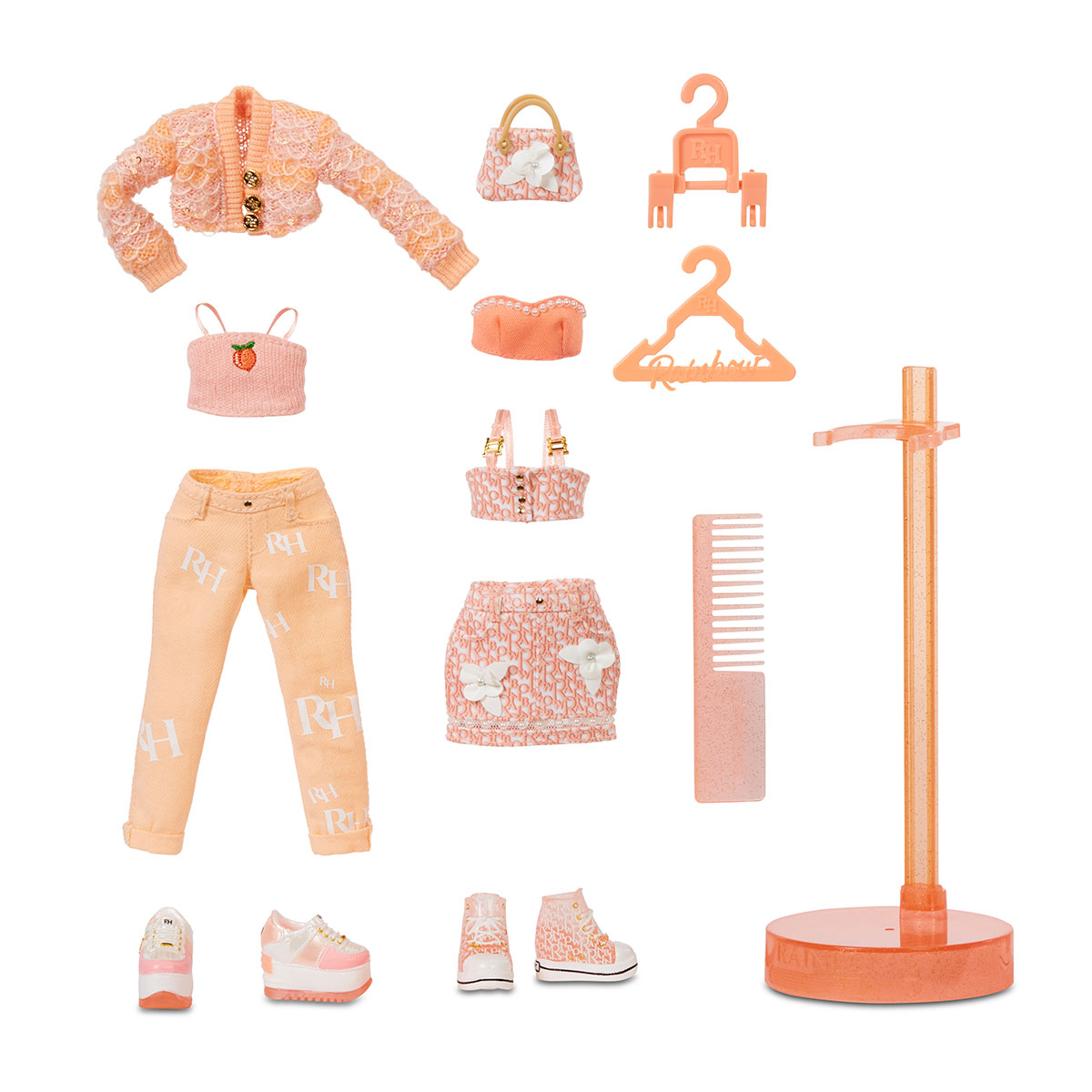 Papusa RAINBOW HIGH S3 - Georgia Bloom (Piersic) este o frumusete fermecatoare, cu par si haine de culoare roz fin (piersic).