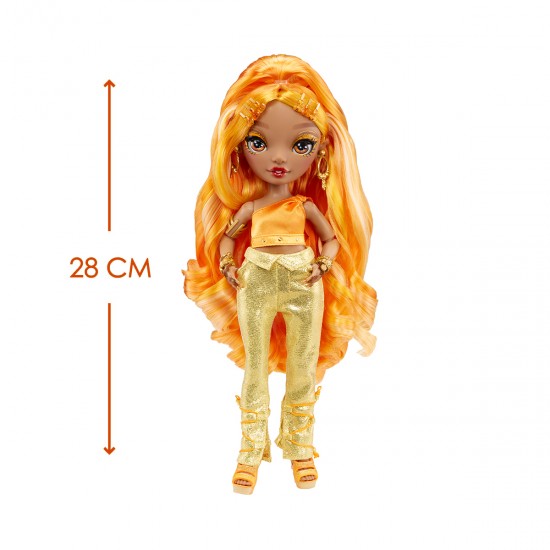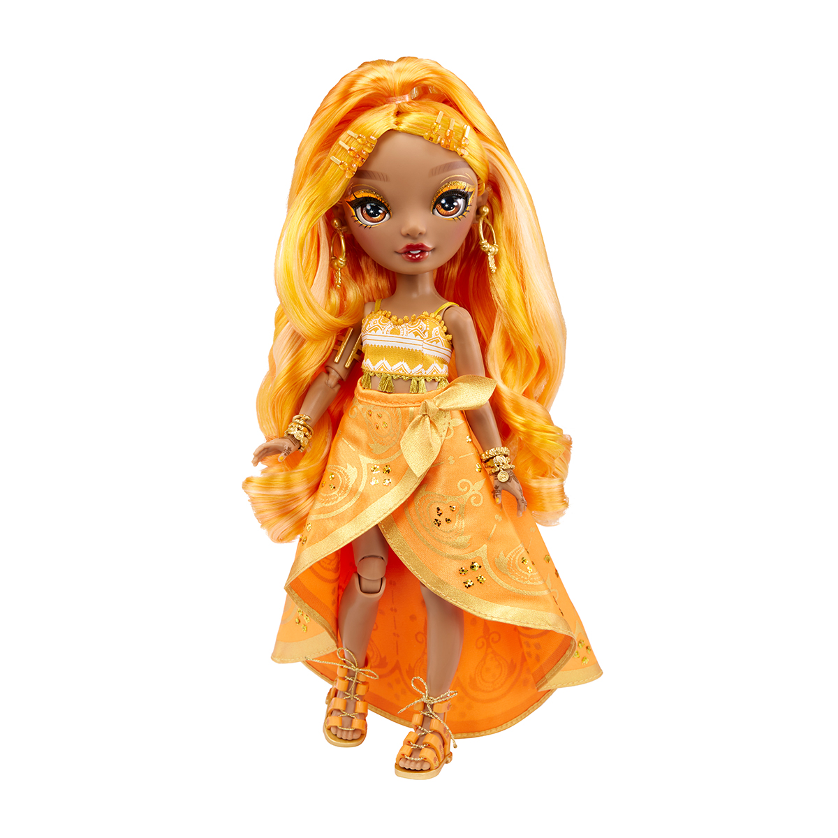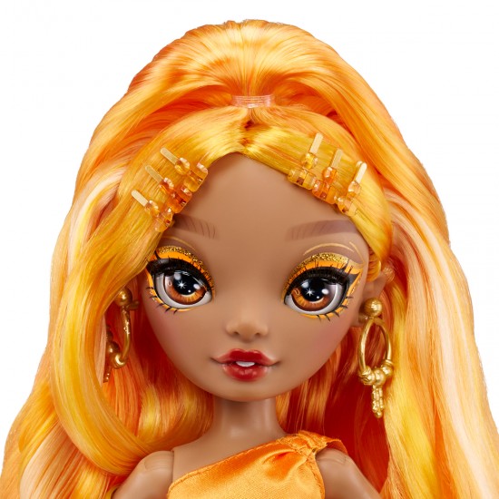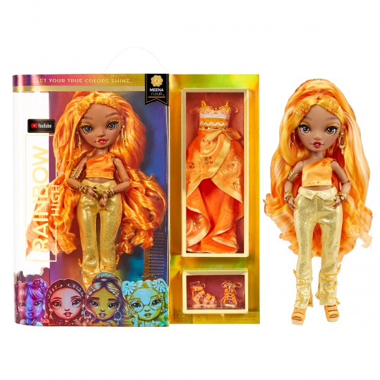 Papusa Rainbow High S4, Meena Fleur, o frumusete fermecatoare cu par si haine aurii.