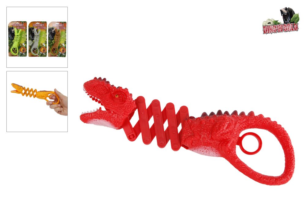 621101 Jucarie Dino cu sistem de apucare 20-31cm diverse culor. Jucarie distractiva sub forma de dinozaur cu gura deschisa care se manipuleaza asemeni unui pistol, la apasarea tragaciului capul dinozaurului se intinde inainte si gura se deschide, astfel functioneaza sistemul de apucare de fiecare data cand apesi. Jucaria poate avea diverse culori ca: verde, rosu, maro, gri sau galben.