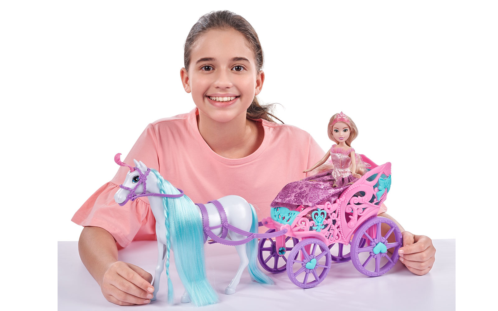 Orice printesa are nevoie de o trasura pe masura. Alege chiar acum setul cu papusa si trasura cu calul si creaza cea mai deosebita poveste cu printese care a existat vreodata. Datorita materialelor calitative din care sunt create, atat papusa cat si trasura vor rezista pe drumurile cu obstacole sau in jocurile imitative, spre exemplu Cenusareasa care fuge de la petrecerea de la palat.