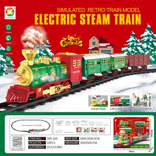 Setul este format din 10 elemente realizate cu precizie si frumos finisate, care pot fi aranjate dupa propria imaginatie. Mai mult, trenul emite efecte de fum, lumini si sunete.