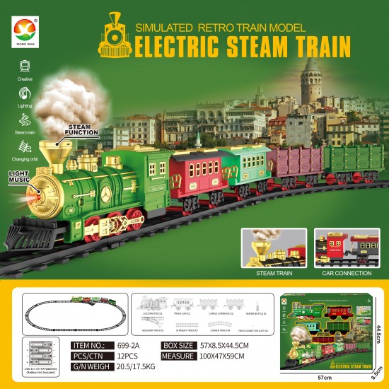 Setul este format din 12 elemente realizate cu precizie si frumos finisate, care pot fi aranjate dupa propria imaginatie. Mai mult, trenul emite efecte de fum, lumini si sunete.