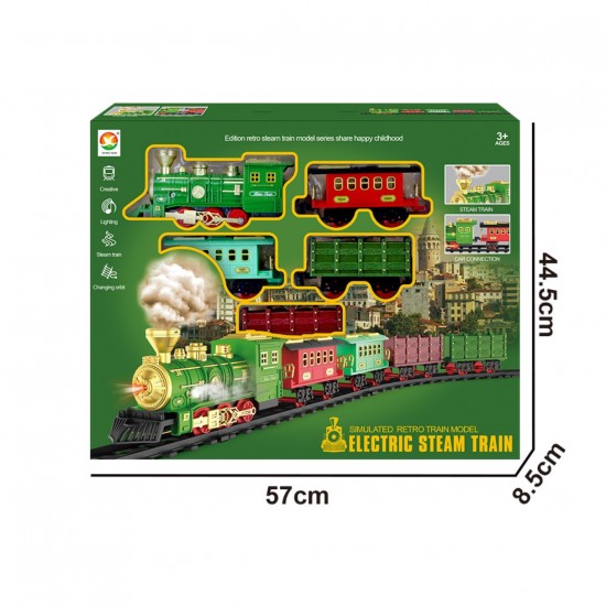 Set Tren Retro verde cu cale ferata si 4 vagoane, sunete, lumini, efect fum