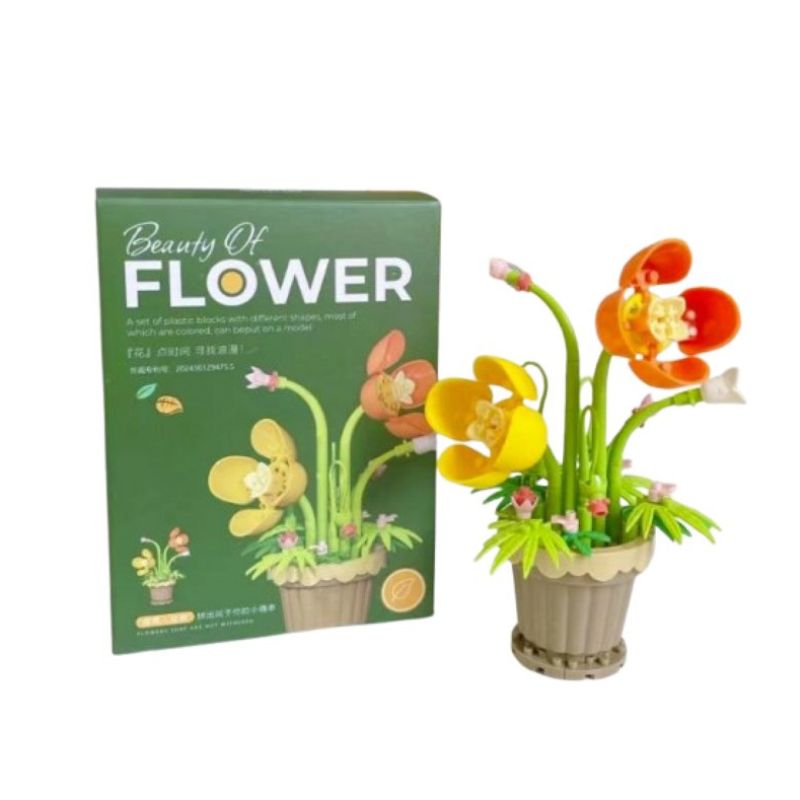 - Detalii realiste: Ghiveciul stabil si petalele specifice ale narcisei sunt realizate cu precizie din blocuri de plastic colorate, oferind un aspect estetic deosebit.