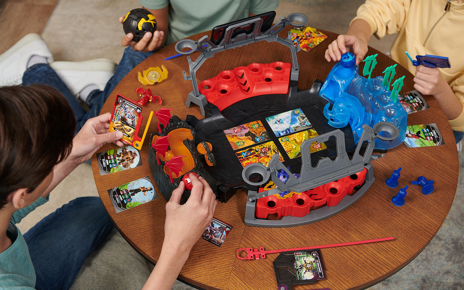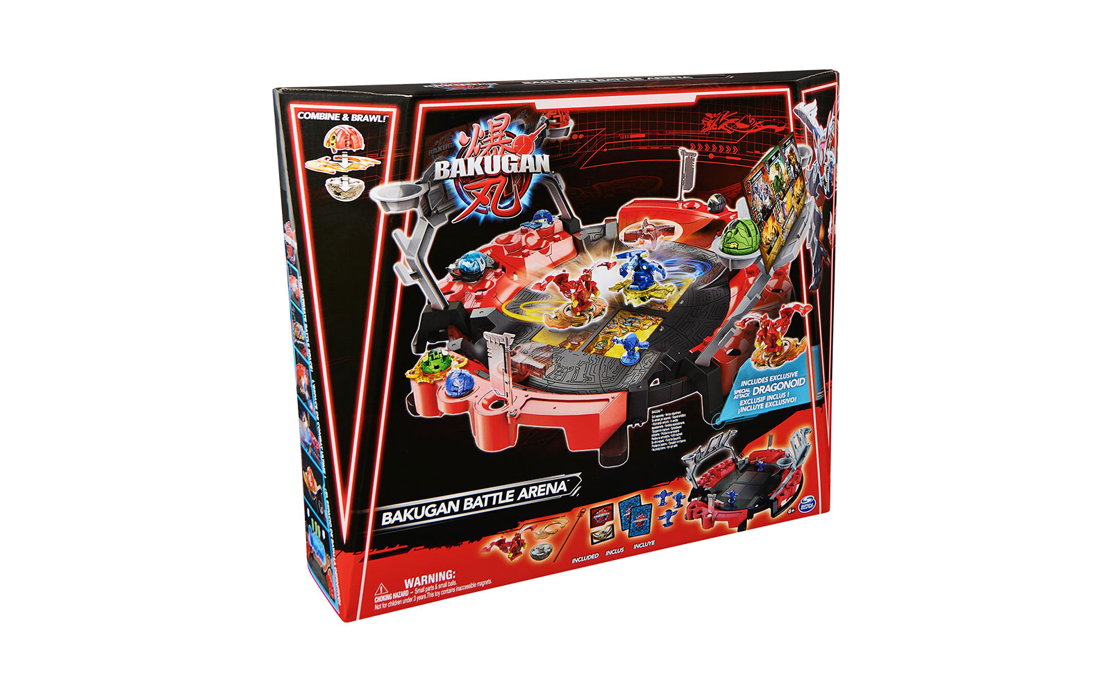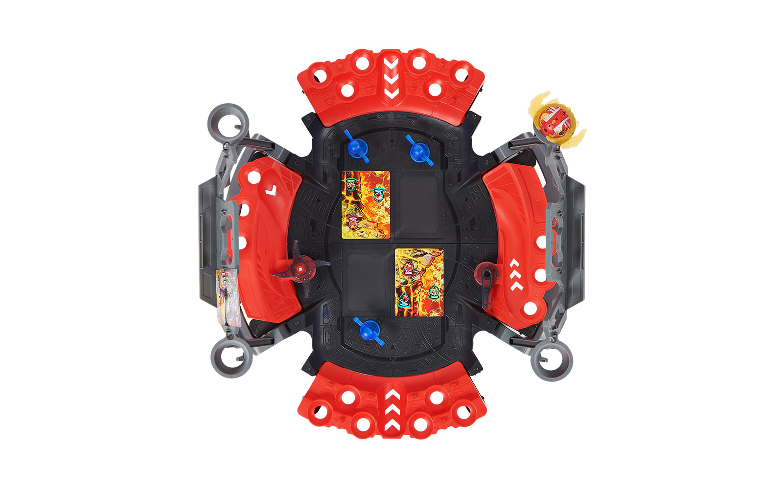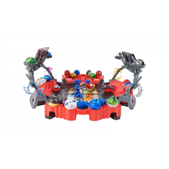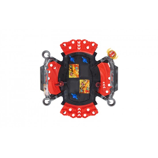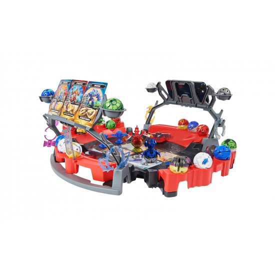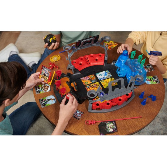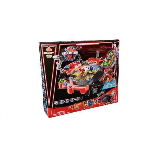 Construieste-ti Arena de lupta cu steaguri de clan si totemuri de lupta pentru a crea obstacole unice. Glisati, invartiti si loviti-va Bakuganul pe diferite obstacole cu roti si palete pentru un joc unic. Aceasta arena include un Dragonoid Bakugan exclusiv de atac special (invartire) si carti de schimb pentru a te ajuta sa intri in actiune. Folositi cordonul XL pentru a invarti Bakuganul exclusivist sau rostogoliti Bakuganul asamblat pe cartile de poarta pentru a le urmari transformandu-se cu transformarile iconice pop-deschise.