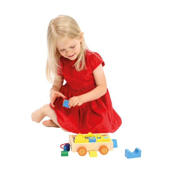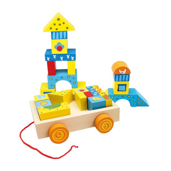 Carucior din lemn cu sfoara si cuburi de construit, 19 piese