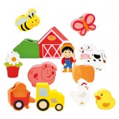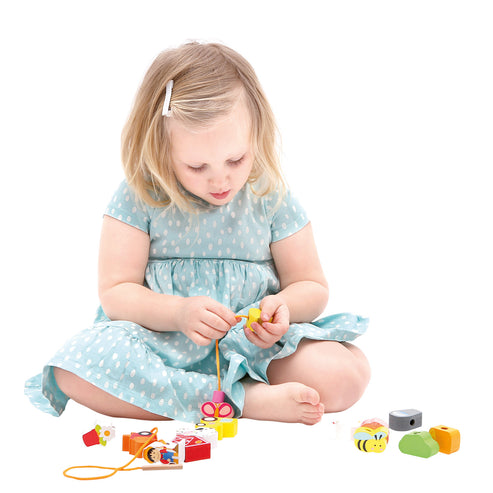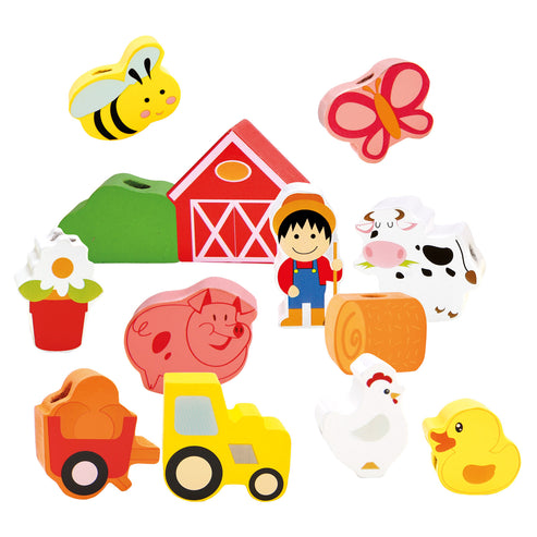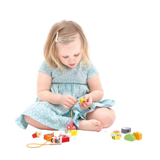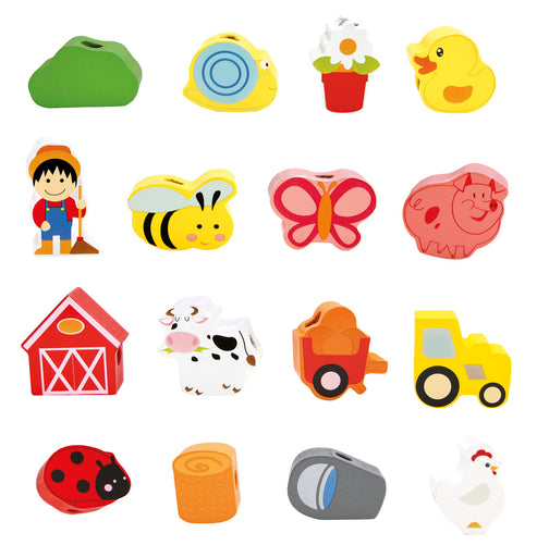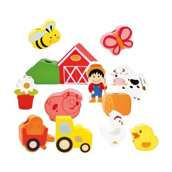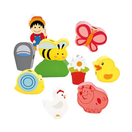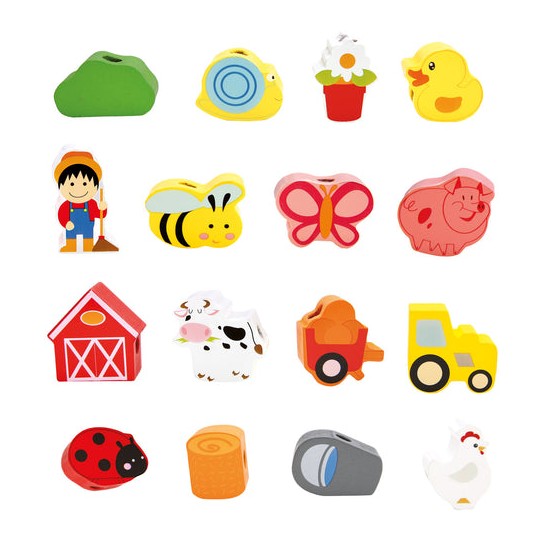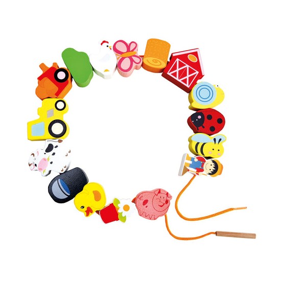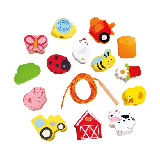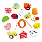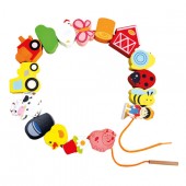 Jucaria de cusut cu siret si ac din lemn ajuta copilul sa invete culorile si chiar sa numere toate obiectele si animalutele.