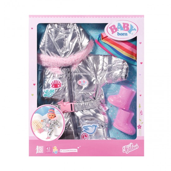 Baby Born este o adevarata fashionista care stie sa combine confortul si frumusetea intr-o maniera super eleganta. Si sunt atat de multe lucruri deosebite in garderoba ei. Priveste numai acest set original: salopeta argintie, palarie cu dungi si cizmulite roz. Papusica ta nu va ingheta de frig cu aceste hainuite calduroase si extraordinar de atractive.