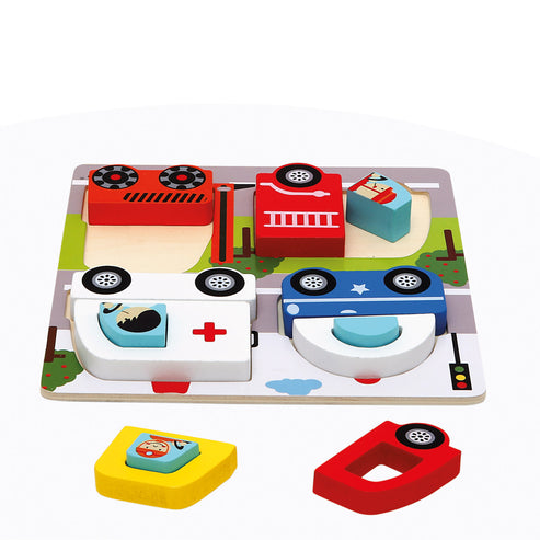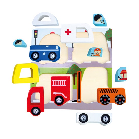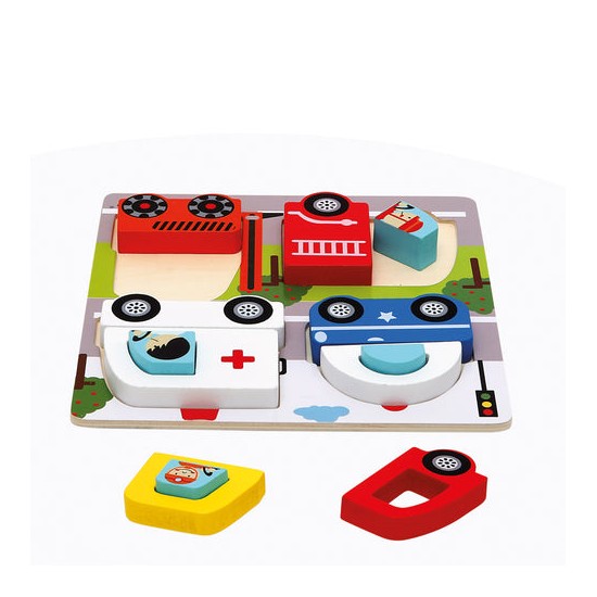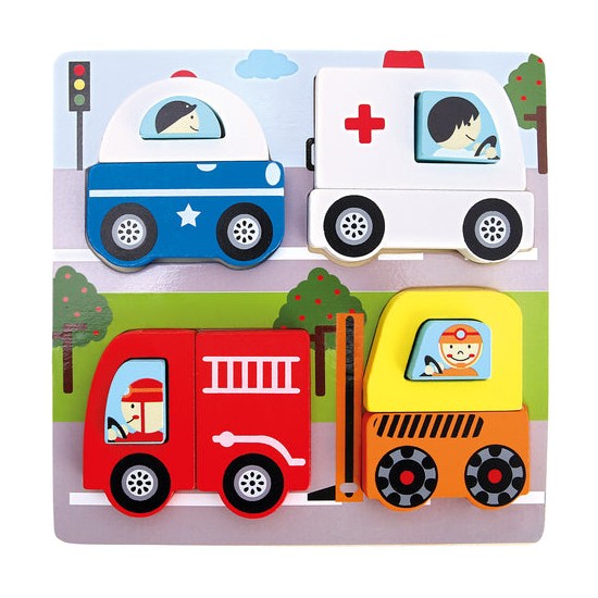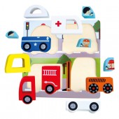 Puzzle educativ din lemn, Vehicule de salvare, 18x18x1,5 cm, 13 piese