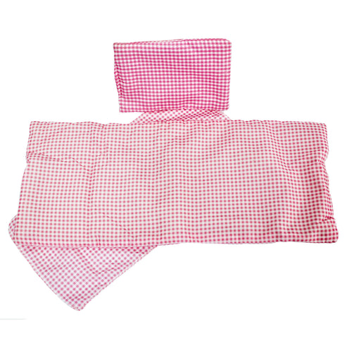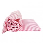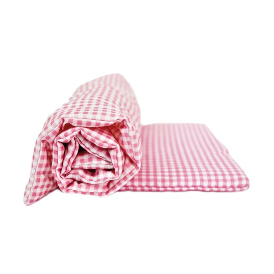 Patucul este echipat cu lenjerie de pat in culoare roz si alba.