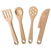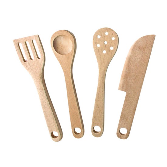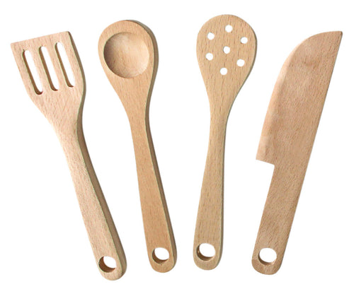 Accesorii din lemn: furculita, cutit, lingura, oala cu capac si tigaie cu capac.