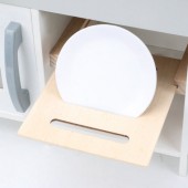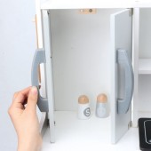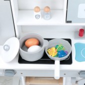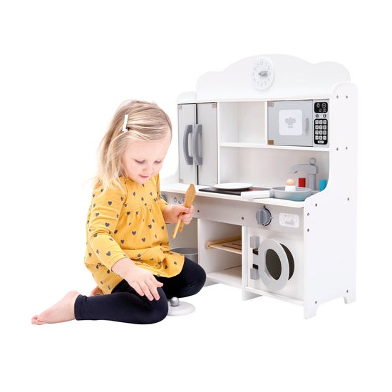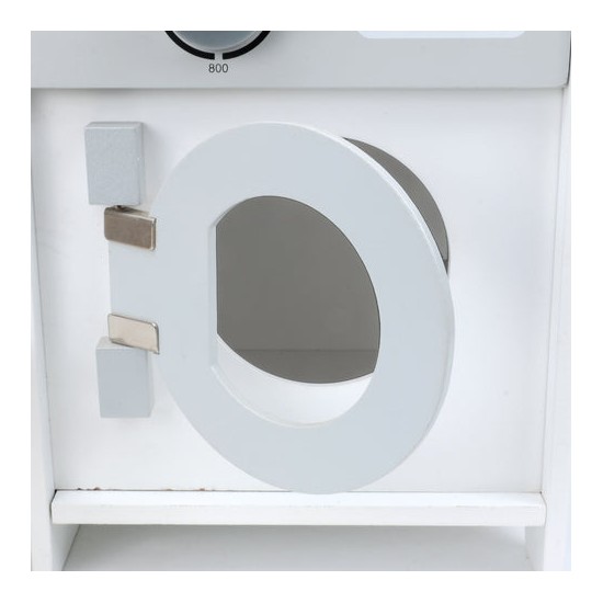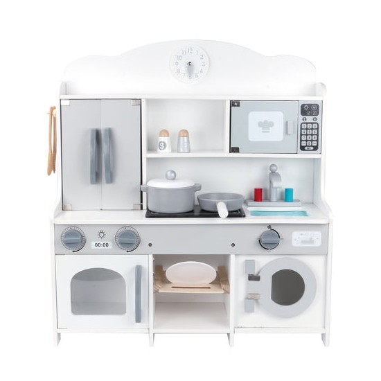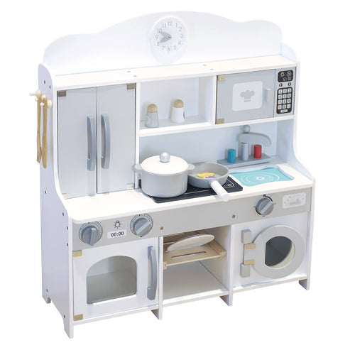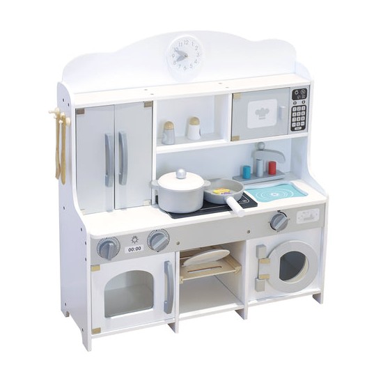 Bucatarie din lemn pentru copii cu masina de spalat, culoare alba, cu 12 accesorii, 64x69x23 cm