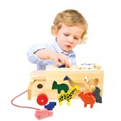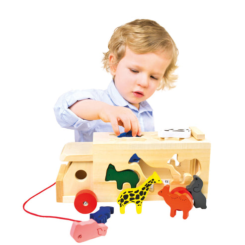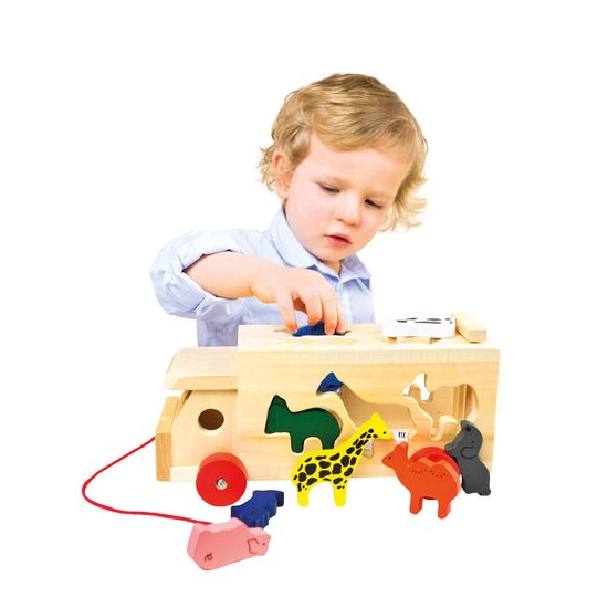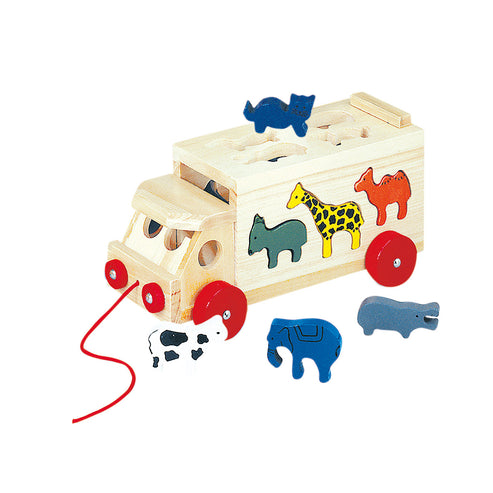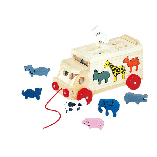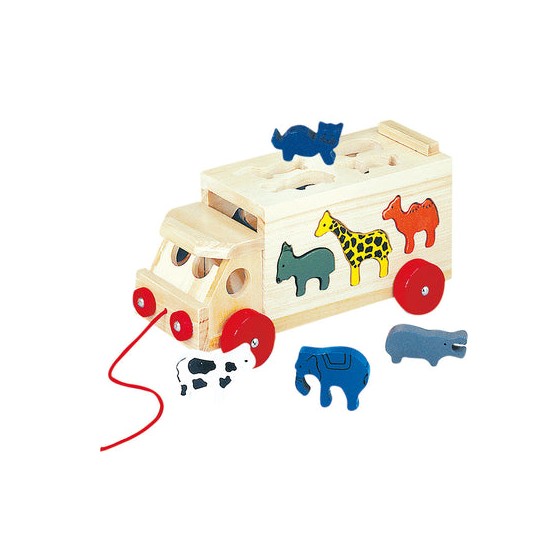 Jucarie cu sfoara camion-sortator din lemn cu figurine animale