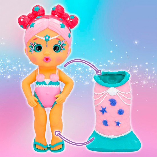 Papusa are o coada frumoasa de sirena cu sclipici si o diadema fermecatoare.