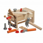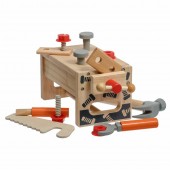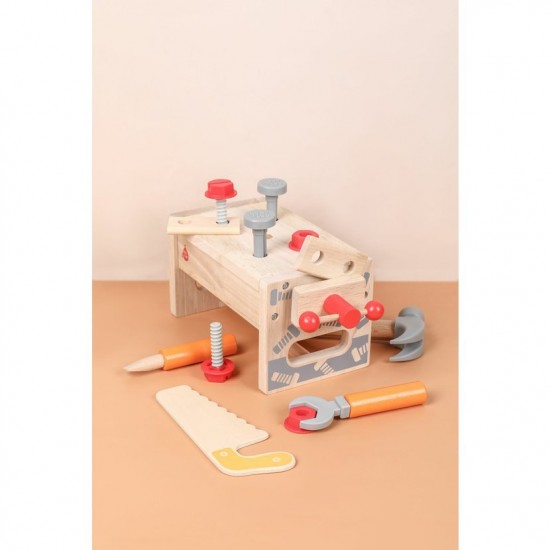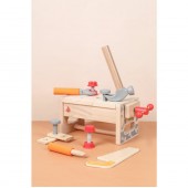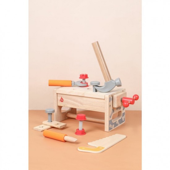 Setul este format din 15 piese si este realizat din plastic si lemn de calitate cu finisaj neted. Piesele sunt, de fapt, unelte de lucru: ciocan, ferastrau, suruburi, surubelnita, cheie, menghina, lemn neted cu gaur.