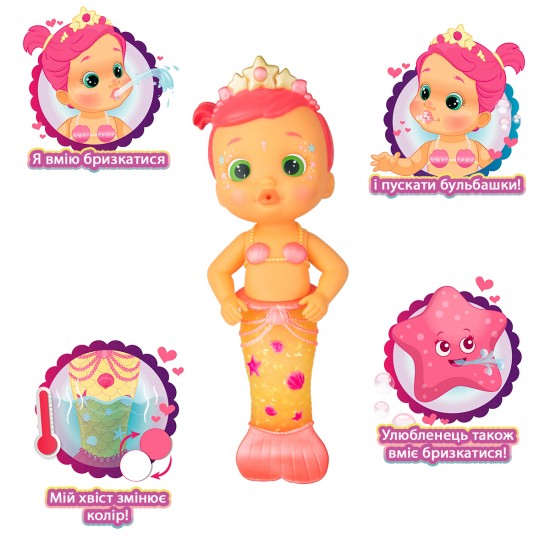 Daca pui papusa in apa calda, unele elemente ale cozii isi vor schimba culoarea! Iar daca ii dai papusei sa bea apa cu sapun, aceasta va stropi sau va sufla cu bule!
