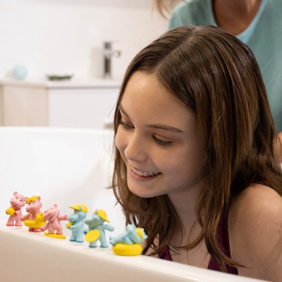 Faceti cunostinta cu Hipopotamii! Transforma ora baii intr-un joc distractiv si colorat cu spuma colorata si moale, care contine o jucarie surpriza.