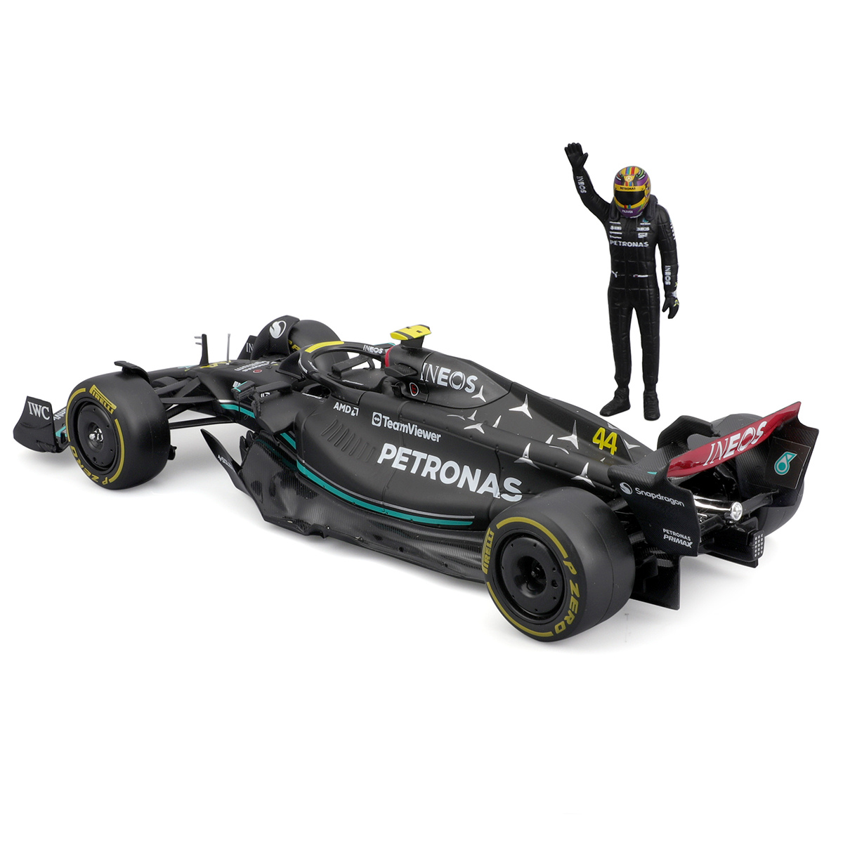 Automodelul cu figurina Mercedes-AMG F1 W14 E Performance Bburago este un cadou ideal pentru fanii Formula 1 si colectionari. Bolidul W14 a concurat in sezonul F1 2023 pentru echipa Mercedes-AMG Petronas, fiind pilotat de Lewis Hamilton (#44) si George Russell (#63). In acel sezon, Hamilton a incheiat campionatul pe locul 3, iar masina a folosit celebra livrea neagra.