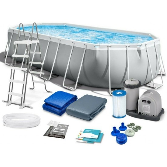 Piscina Ovala Premium Intex Prism Frame, 610 x 305 x 122 cm, 18202 L, Set Complet: Pompa, Scara, Prelata si Covoras