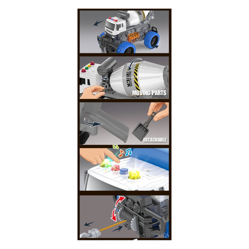 Camionul betoniera JS102BS este o jucarie interactiva si robusta, ideala pentru copiii pasionati de vehicule de constructii si utilaje grele. Realizat la scara 1:16, acest model impresioneaza prin rotile mari, rezistente, care asigura stabilitate si deplasare usoara pe diverse suprafete. Camionul este echipat cu mecanism cu inertie pentru miscare naturala, precum si cu efecte sonore si luminoase care imita functionarea reala a unei betoniere. Designul detaliat si tamburul de betoniera mobil ofera un plus de realism, incurajand jocurile de rol si dezvoltarea imaginatiei. Jucaria contribuie la coordonarea mana-ochi si la intelegerea activitatilor din domeniul constructiilor, fiind potrivita atat pentru joaca in interior, cat si in aer liber.