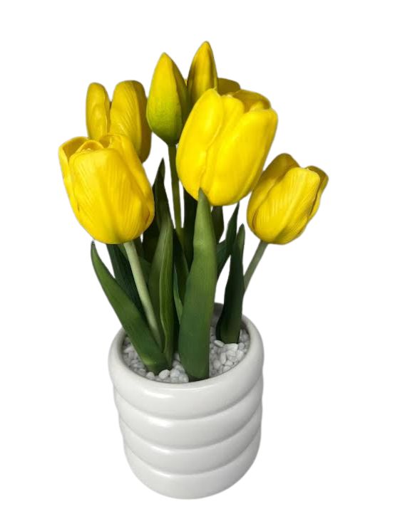 Lalele artificiale in ghiveci 31 cm, galben, model ZJA361811 sunt un element decorativ luminos si elegant, potrivit pentru orice tip de interior. Aranjamentul contine mai multe lalele galbene cu aspect realist, frunze verzi naturale si este amplasat intr-un ghiveci decorativ alb, completat cu pietricele ornamentale.