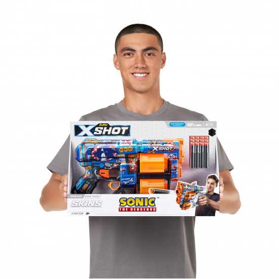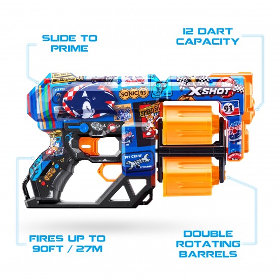 Alege Blasterul X-Shot Skins Dread,Sonic Race Team si alatura-te luptei! Acest blaster nu trebuie sa lipseasca din colectia ta. Niciodata nu veti ramane fara munitie. X-Shot Skins Dread are o capacitate de 12 sageti cu doua butoaie rotative. Cand nu va raman sageti intr-un butoi, treceti la celalalt pentru a continua lupta. De asemenea, sunt incluse 12 sageti de spuma.