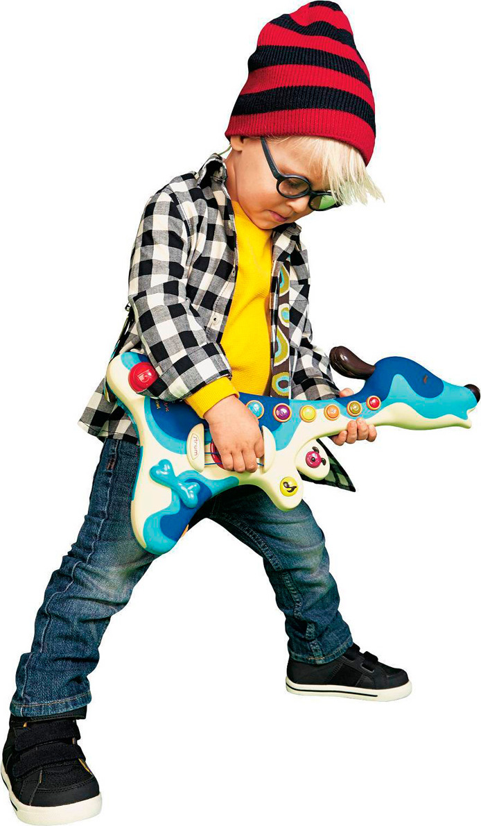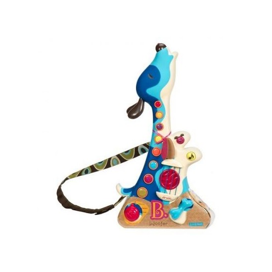 Jucaria are forma unui caine simpatic care canta la chitara, cu detalii colorate si atractive care capteaza atentia. Cand este apasat butonul sau cand jucaria este activata, cainele produce sunete muzicale, imitand o melodie jucausa sau acorduri de chitara.
