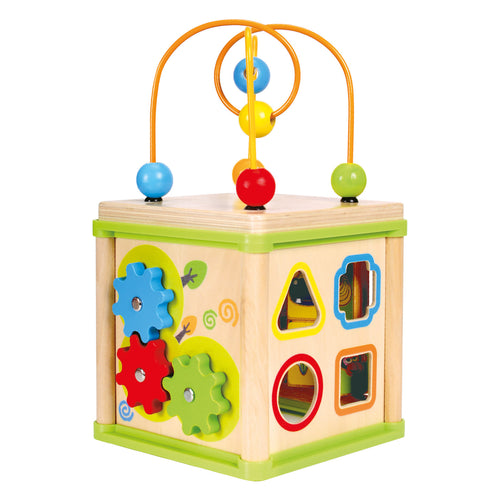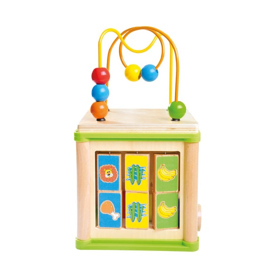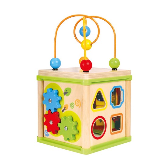 Elementele educative ale cubului cuprind: forme care trebuie sortate, roti care pot fi invartite, piese care trebuie deplasate, imagini, numere si forme care trebuie recunoscute.