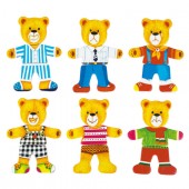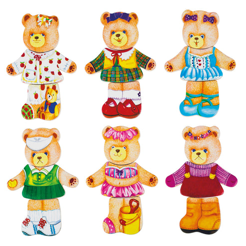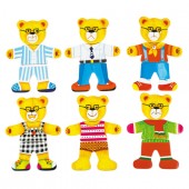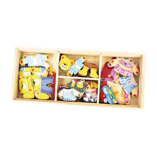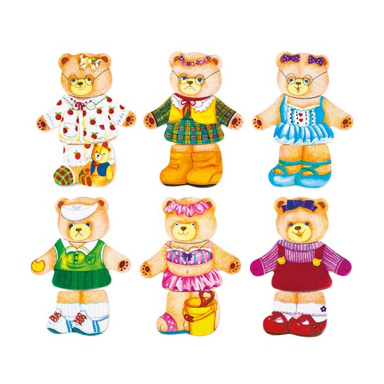 Capacul cutiutei are decupaje pentru cei 4 ursuleti: mama, tata, fratele, sora, iar copilul trebuie sa protriveasca hainutele dupa cum doreste.