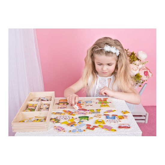 - 72 de piese din lemn care se imbina sub forma de puzzle ce reprezinta imbracamintea si capete de ursuleti;