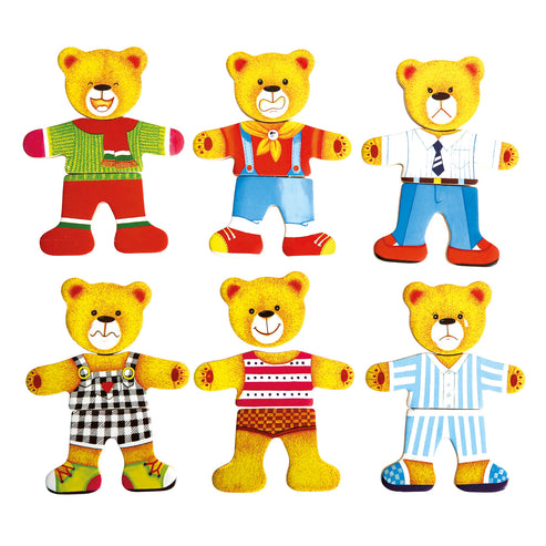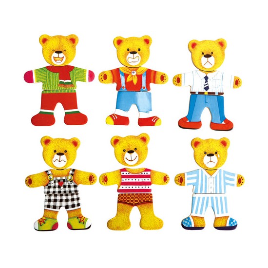 - 18 piese din lemn care se imbina sub forma de puzzle ce reprezinta imbracamintea si capul de ursulet.