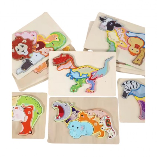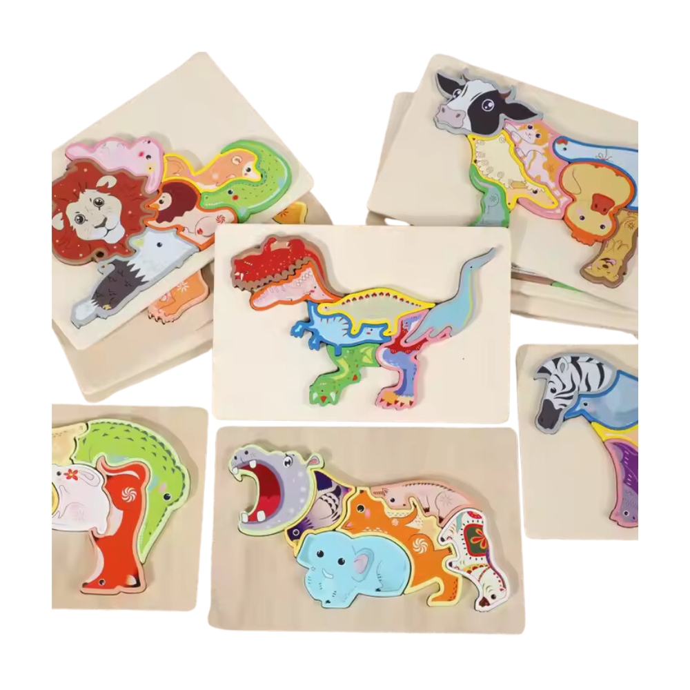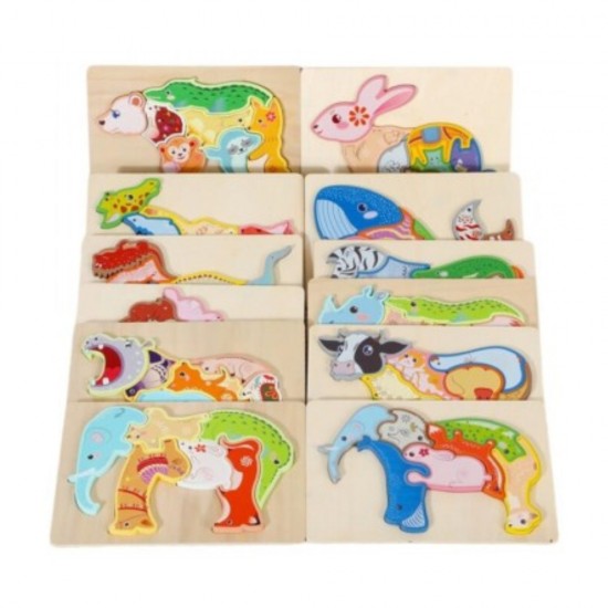 Puzzle din lemn educativ creat special pentru copii mici, care ii ajuta sa invete despre diferite animale, culori si forme, dezvoltand in acelasi timp abilitati motorii fine si coordonarea mana-ochi. Fiecare piesa de puzzle este vopsita in culori vibrante si ilustreaza diverse animale, cum ar fi elefanti, lei, zebre si altele. Aceste desene atragatoare capteaza atentia copiilor si ii ajuta sa invete sa recunoasca si sa numeasca animalele.
