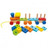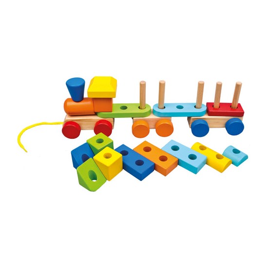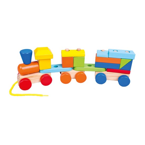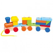 Tren din lemn cu sfoara si doua vagoane, 19 piese, 34x 11 x 7 cm